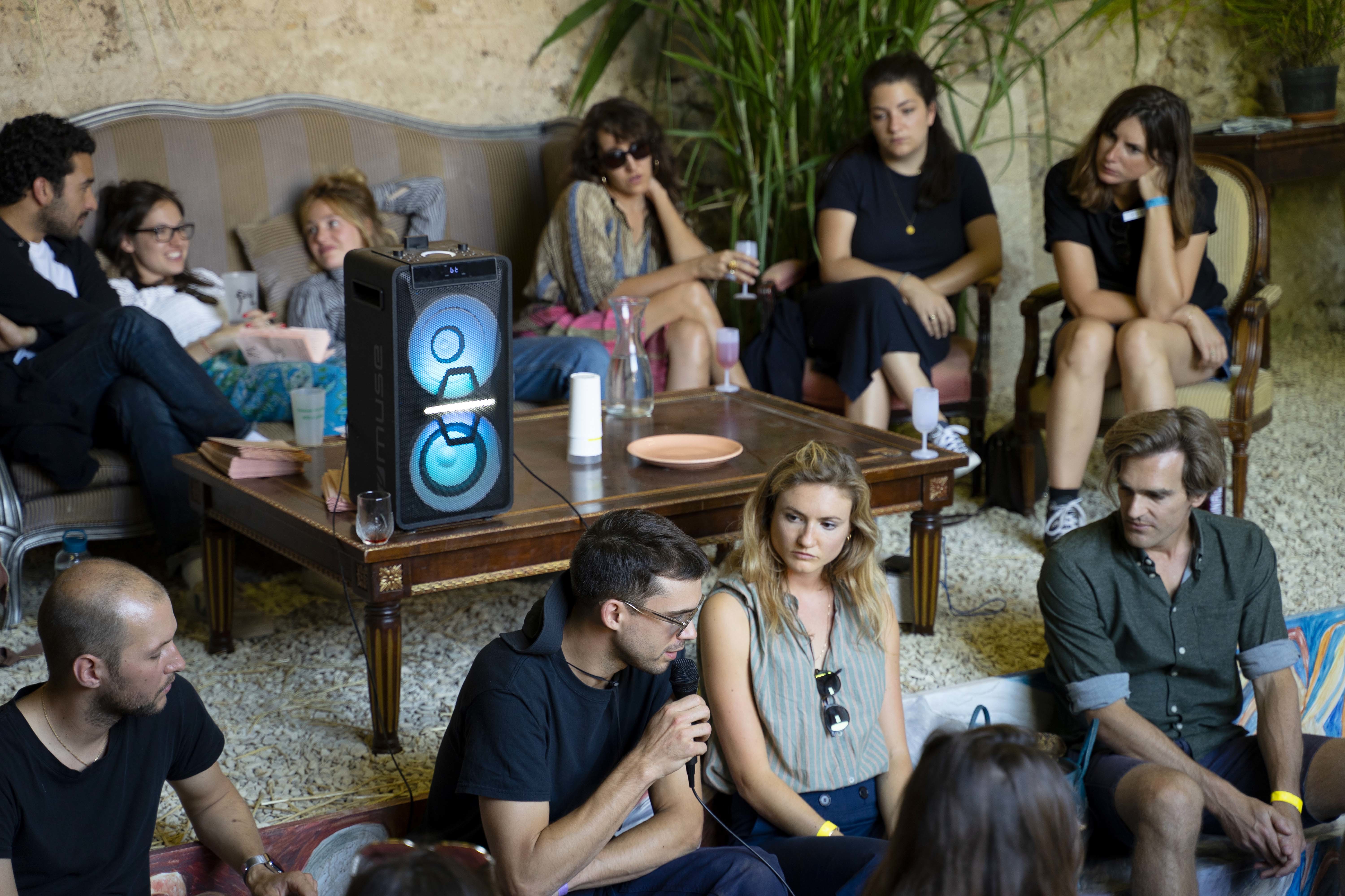 C'est dans le Conversation Pit, œuvre créée par le duo d’artistes Jacent Varoym (Jade Fourès-Varnier et Vincent de Hoÿm) lors de la première édition de Feÿ, que les “Talks” ont cette année pris place. Situé près de la ferme et du puits dans l'aile droite du parc du château, le panel de discussions a suscité la curiosité d'un grand nombre de festivaliers. Assis par terre près de grands bambous prêtés par la jardinerie Baron, ou plus confortablement installés dans le mobilier d'époque emprunté aux salons du château du Feÿ, des visiteurs de tout âge, venus de Joigny, Frankfurt, Lausanne ou Paris, étaient au rendez-vous. Architectes, chefs cuisiniers, artistes, journalistes, étudiants, éditeurs, graphistes, chercheurs et visiteurs... Invité.e.s par Lou de Kerhuelvez et Andréa Losi, ils ont tous et toutes pris la parole pour partager leurs projets, leurs convictions, souvent leur désir de création. Ce week-end là, fermentation (avec Camille Tourny), critique de la jeune création (avec Camille Bardin, Samuel Belfond, Grégoire Prangé de Jeunes Critiques d'Art), collapsologie (avec Laure Nouhalat & Dominique Archambaud), cuisines locales (avec Mathieu Moity, Alexia Duchêne, Lucas Delerry, Céline Maguet, Zoé Lockard), la nature et l'art (avec Ysé Sorel, Guillaume Logé & Alexandre Silberstein), l'amour des livres (avec Federico Nicolao, Sébastien Desplat, Aleï Journal, Klima, First Laid & KD Press) ou encore l’exposition d’art contemporain Bels Animals (avec Indira Bérau, Chloé Royer, Zsófia Keresztes, MORPH Amélie Giacomini & Laura Sellies, Julie Villard & Simon Brossard, Alexandre Silberstein) ont été discutés.